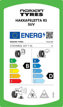 Hakkapeliitta R5 SUV on kestävä, mukava ja erittäin energiatehokas talvirengas. Kevyempi rullaus säästää polttoainetta ja pidentää sähköautojen toimintasädettä. Kevyesti rullaavan pintakuvion ja uuden Green Trace -sekoituksen ansiosta Hakkapeliitta R5 SUV:n vierintävastusta on parannettu entisestään. Ympäristöystävälliset ajo-ominaisuudet perustuvat luonnonkumin, kierrätysteräksen, kasvipohjaisten öljyjen ja mäntyhartsin kaltaisiin raaka-aineisiin. Yli kolmasosa uudesta sekoituksesta koostuu uusiutuvista ja kierrätetyistä materiaaleista.